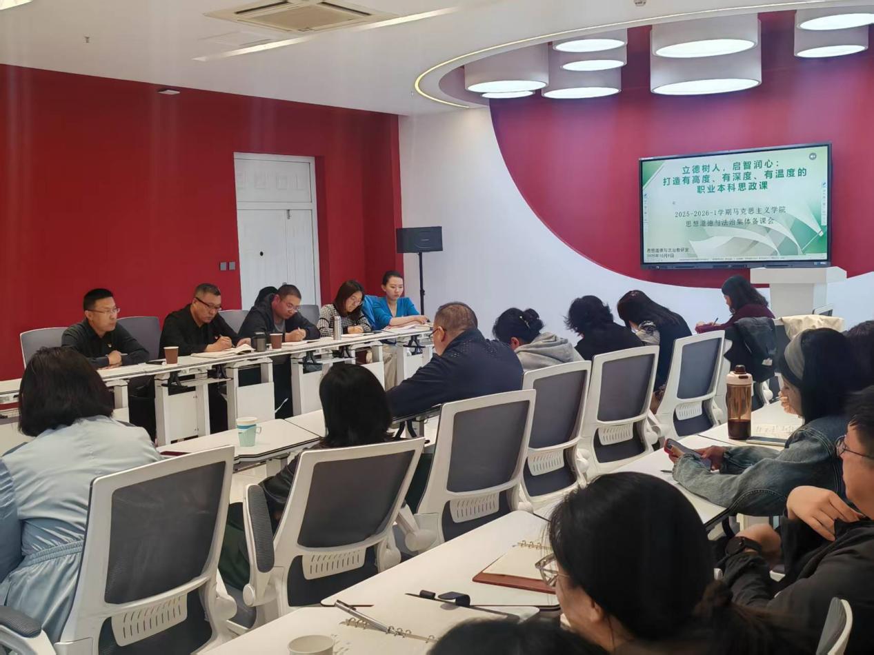 为落实立德树人根本任务,进一步深化思政课建设与党的创新理论武装同步推进,凝聚集体智慧,破解教学难题,创新教学方法,切实提升我校思政课教学的亲和力与针对性、实效性与吸引力,10月9日马克思主义学院思想道德与法治教研室召开主题为“立德树人,启智润心:打造有高度、有深度、有温度的职业本科思政课”的集体备课会。校领导范志忠书记、牛建刚校长、赵金龙副校长、张利君副书记、王利俊部长和马克思主义学院全体教师参加本次集体备课会。